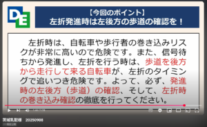 今回の研修で学んだように、発進時には必ず左後方の歩道を確認し、