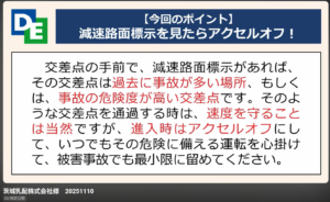 動画では、交差点に進入する際の運転動作を一つひとつ確認し、